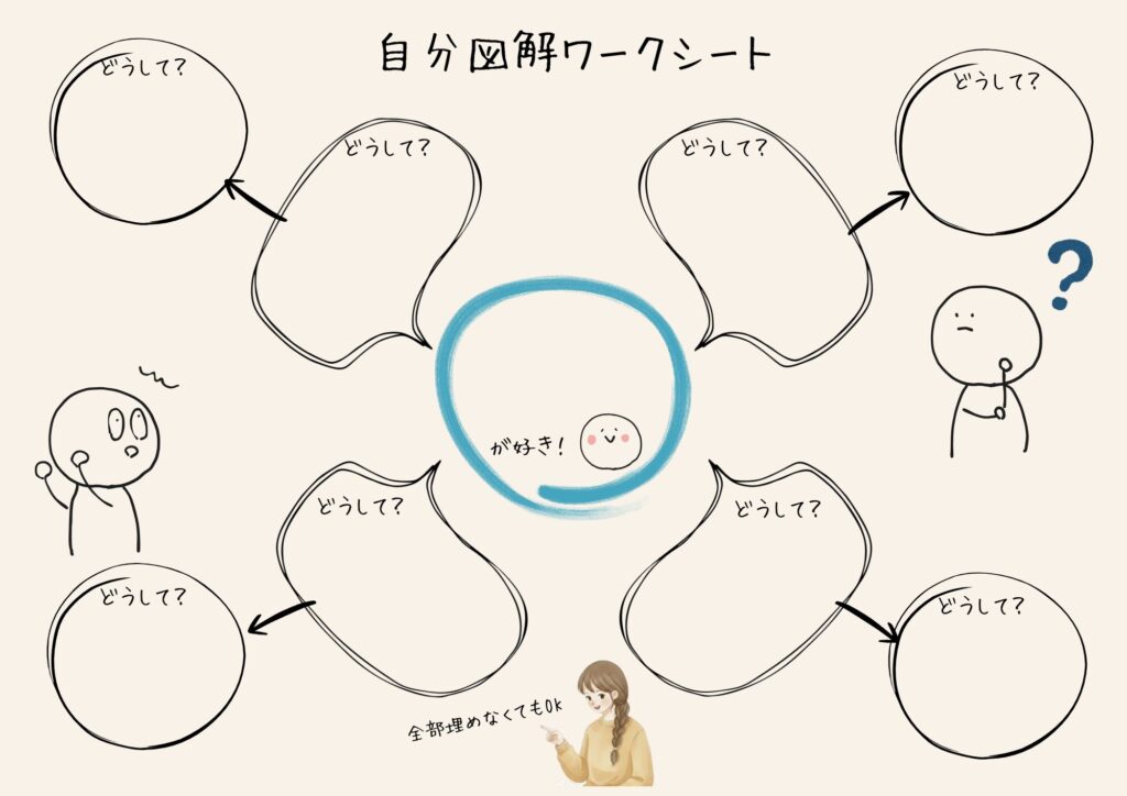 きれいに書こうと思わなくて大丈夫。 ノートの落書きのような感覚で、まずは真ん中のマルに「今、好きなこと」を書き込んでみてください。そこから伸びる矢印が、あなたも知らなかった「本当の自分」へと導いてくれるはずです。